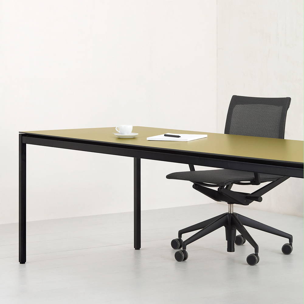Ob als Schreibtisch im Büro oder als privater Esstisch – der Thesis verbindet Leichtigkeit und Eleganz mit einer minimalistischen Formensprache. Die zurückversetzten Zargen erzeugen den Eindruck eines schwebenden Tischblattes.
