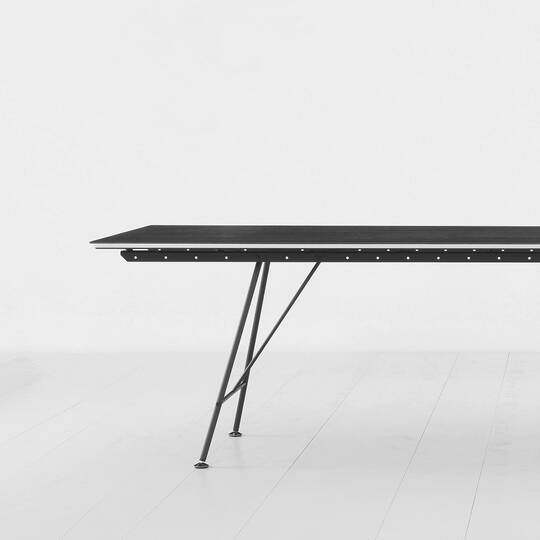 Sie ruht auf einem Untergestell aus Stahl in Schwarz oder Dunkelbronze pulverbeschichtet. Der Tisch ist 75 Zentimeter hoch, hat eine Breite von 79 oder 90 Zentimetern und kann zwischen 79 und 300 Zentimetern lang sein, je nach Funktion und Raumgrösse.