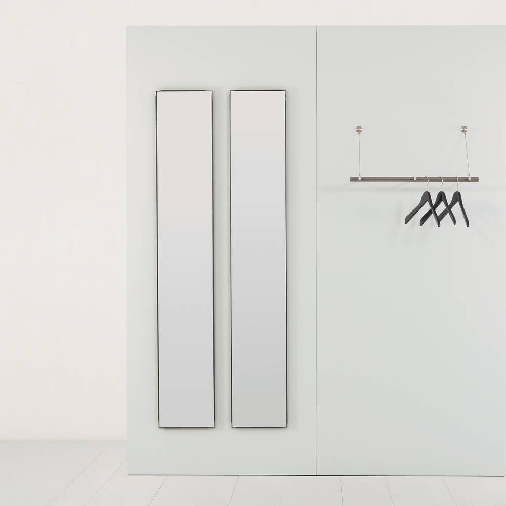Der Spiegel mit dem schmalen Rohstahlrahmen hat mit 30 Zentimetern Breite, 180 Zentimetern Höhe und 2,5 Zentimetern Tiefe eine geradezu klassische Form und kann sowohl auf dem Boden stehen als auch an der Wand hängen.