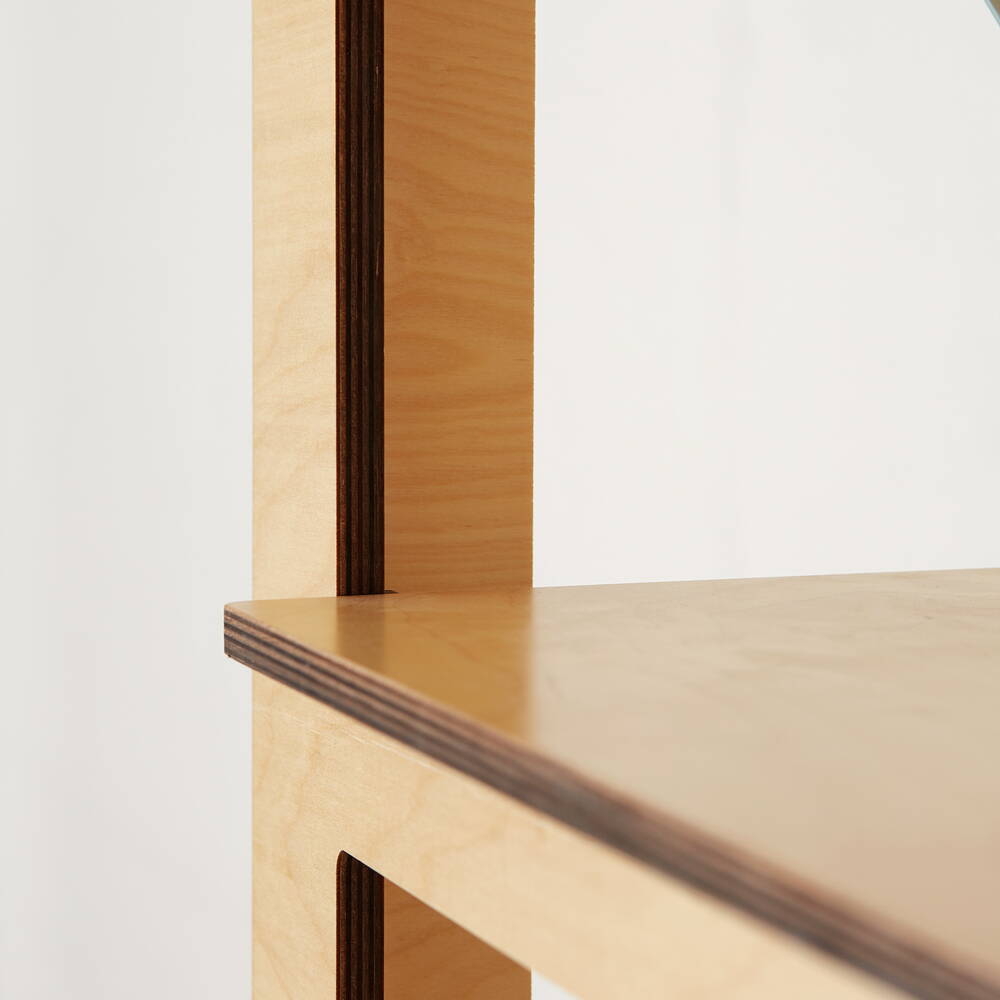 Five shelf boards are lasered out of a large multiplex plate. They are placed horizontally across the plate and held by a steel bracket. When books or other objects are placed on the boards, they press against the wall, thus stabilizing the whole shelf, which casually leans against the wall. Pretty amazing!