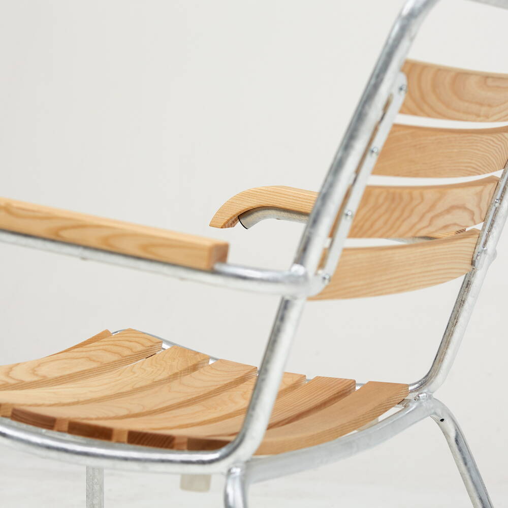 Like all the pieces in the series, the lounge chair is made in Switzerland from hot-dipped steel and solid, weatherproof Swiss ash.